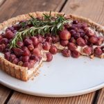 I made this but omitted the rosemary and vinegar (just didn’t sound appetizing for a dessert). I also realized too late that the roasted grapes should be drained before being scraped onto the filling. I had thought the liquid would end up more of a syrup but it was very watery. I was able to pour most of it off afterwards. Since I don’t have a tart pan I used a 10″ pie plate. I should have baked the crust a lot less–it ended up glued to the pan, which made all the slices break up when I tried to serve it. Even so, this was FABULOUS. I would do it just like this next time, except that I would bake the crust less and pour off the grape liquid before placing them on the filling. This is a fabulous way to use up sour grapes! Company worthy!